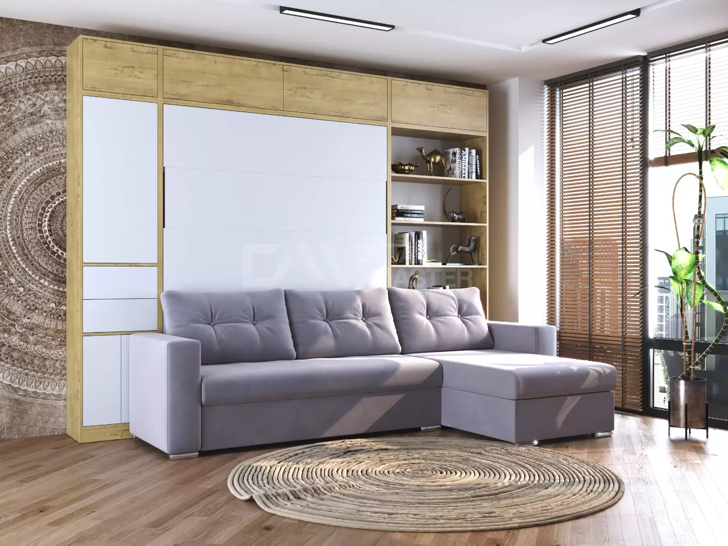 Шкаф-кровать трансформер с диваном "Big Family Balance"работает на механизме раскладывания собственной разработки "Balance". Кровать раскладывается легким движением руки, превращаясь в полноценное спальное место. Просто потяните за ножку-маятник, которая самостоятельно фиксируется в нужное положение при опускании.